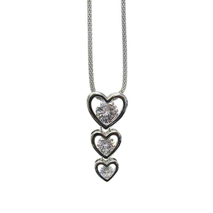 A variation on our popular three drop necklaces. Three rhodium teardrop hearts enclosing large 5A zircon crystals on a glittering 46 cm snake chain + 7 cm extension. Pendant 4cm long x 1.6 cm. Packed in Jax hanging sales card with barcode. WAS $12.