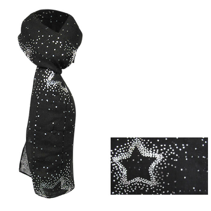 Black scarf with silver stars. 100% polyester, 85 cm x 172 cm. WAS $8.90, now on Clearance. -