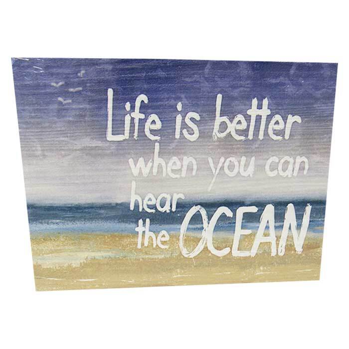 "Life is better when you can hear the OCEAN" textured art sign. Measures 26 cm x 19.5 cm x 3 cm
