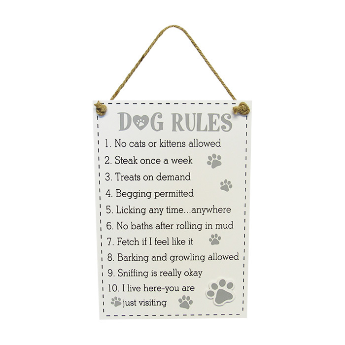 MDF dog rules sign with twine hanger. 35 cm long by 24 cm wide. Buy the range and save, see SKU: E4787ST. -